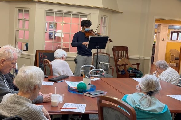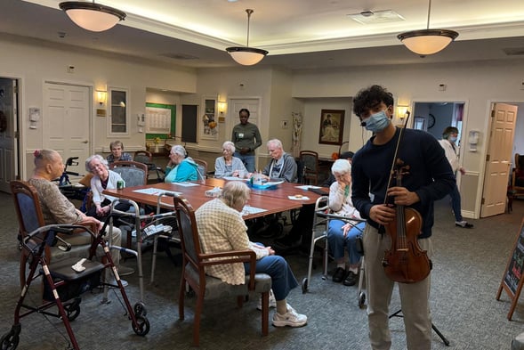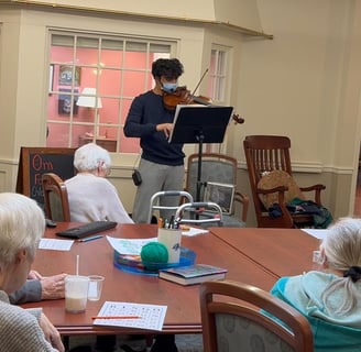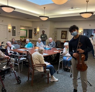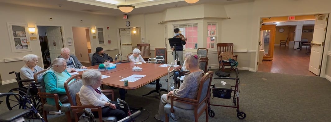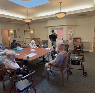 Meadow Lakes Health Centre was the eleventh location where I played. Upon arriving at the health centre, I immediately saw the beauty within the center: it was a large open place with a library, several activity rooms for the elderly, and the lively atmosphere embedded within it. However, I eventually learned that such things came at a price because the walk to where I performed took five minutes. I met some of the elderly, where some were tired and others were excited to see me perform. I quickly set up and began to play some music!