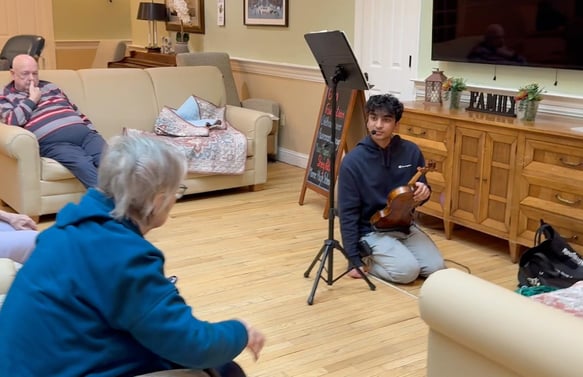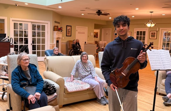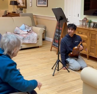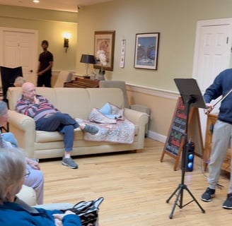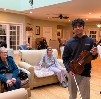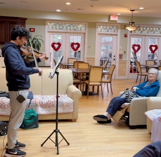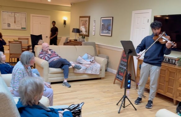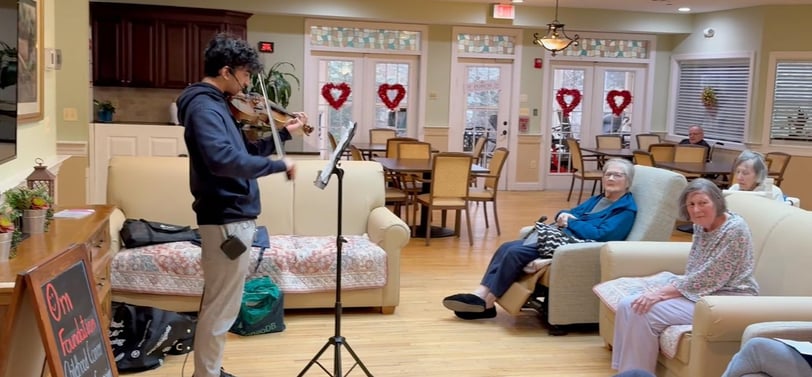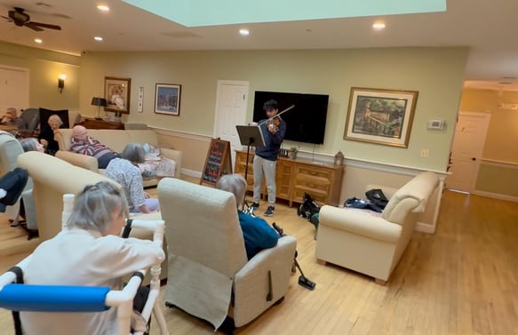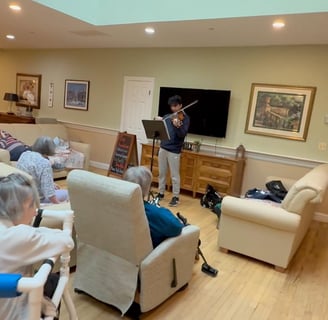 Millennium Memory Care at Monroe was the seventh location where I played. Initially, I thought it was going to be an ordinary performance, however, I was mistaken. When my dad and I entered, I noticed that this wasn't just a standard assisted living center, it was for much older people. I immediately noticed that some of them struggled to communicate and hear, which motivated me to play even better for them. Setting up was quite awkward because usually I get asked questions, or there is random chatter, but neither was present.