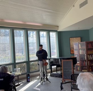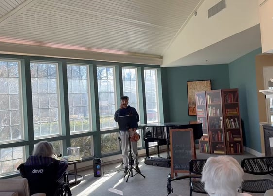 Mira Vie At Foresgate was the fifth location where I played. This was the first performance where I arrived late, and I felt pretty guilty about it. I arrived at around 2:05, and I saw the audience, bored out of their mind, just waiting for me to play. Although the crowd was small, I still wanted to make their performance memorable for them. When I started playing, I noticed that something was off about my performance, as I was making some obvious mistakes. So many times during the performance, I had to make up some of the rhythm so that I can trick the audience into believing that I hadn't messed up.